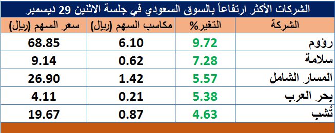ارتفاع أسهم 202 شركة في "تاسي" بتعاملات الاثنين.. "رؤوم" يتصدر بنسبة 9.7%, اليوم الاثنين 29 ديسمبر 2025 03:41 مساءً
