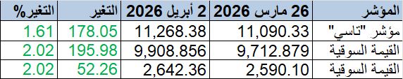 مؤشر "تاسي" يسجل مكاسب أسبوعية 1.61%.. والقيمة السوقية تربح 196 مليار ريال, اليوم الخميس 2 أبريل 2026 07:43 مساءً