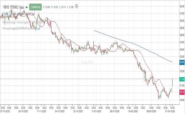 ويتحرك السهم باتجاه هابط دون خط اتجاه ذي زاوية حادة؛ مما يشير إلى قوة الحركة الهابطة وهيمنة القوى البيعية وتسارعها، ويواجه السهم حالياً مقاومة رقمية مستندة على نسب فيبوناتشي التصحيحية قرب 21.85 ريال.