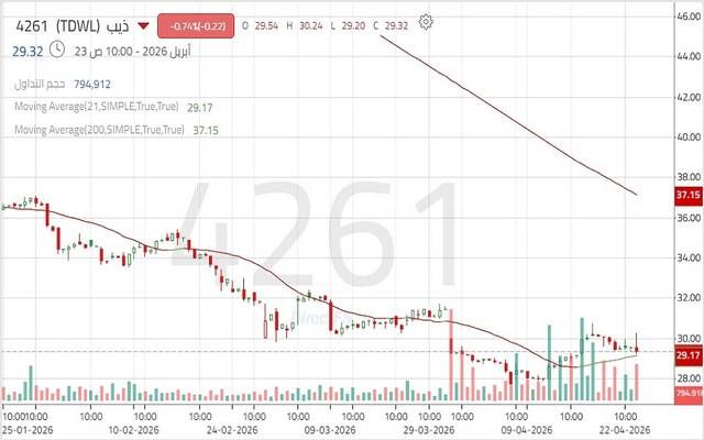 سهم "ذيب" يتحرك في اتجاه هابط رئيسي مع استمرار الضغوط البيعية, اليوم الخميس 23 أبريل 2026 02:39 مساءً