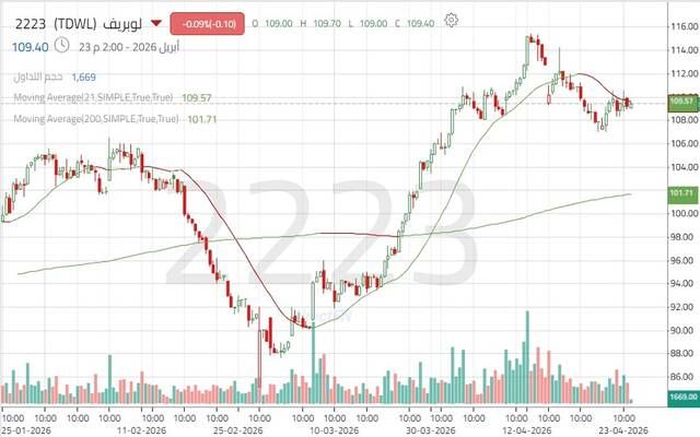 ويختبر السهم حالياً مقاومة فرعية حول 110.50 ريال، وتجاوز المستوى يدفع السهم لمعاودة الصعود نحو 113.10 – 115.70 ريال وفي حال استمرار الزخم الشرائي فسيكون المستهدف التالي حول 118.20 ريال، بينما الثبات دون مستوى 107 ريالات قد يؤدي إلى التراجع نحو مستويات أدنى بالقرب من 105.20 ريال.
