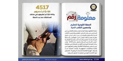 في إطار تبني حلول علمية مستدامة لضمان أمن المواطنين وسلامة البيئة، أطلقت وزارة الزراعة واستصلاح الأراضي «الحملة القومية لتعقيم وتحصين الكلاب الحرة»، والتي تمكنت من تحصين 4517 كلبا ضد مرض السعار وتعقيم 445 كلبا في مختلف المحافظات حتى الآن، وذلك تماشيا مع تحقيق هدف الاستراتيجية الوطنية لـ «مصر خالية من السعار بحلول عام 2030».