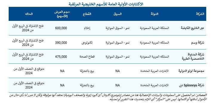 ولفت التقرير إلى أن دولة الإمارات العربية المتحدة تصدرت من حيث إجمالي الاكتتابات الأولية العامة للأسهم في منطقة الخليج العربي في عام 2023؛ إذ تم طرح 7 اكتتابات أولية عامة بقيمة إجمالية بلغت 5.5 مليار دولار شكلت 54% إجمالي قيمة الاكتتابات الأولية العامة للأسهم الخليجية، رغم تراجعها 55% سنوياً.