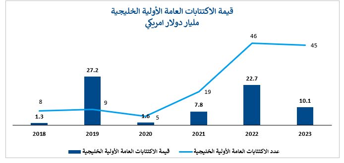 الكويت – مباشر: سجلت الاكتتابات الأولية العامة للأسهم في منطقة دول مجلس التعاون الخليجي 10.1 مليار دولار أمريكي في عام 2023 من خلال 45 عملية طرح أسهم.