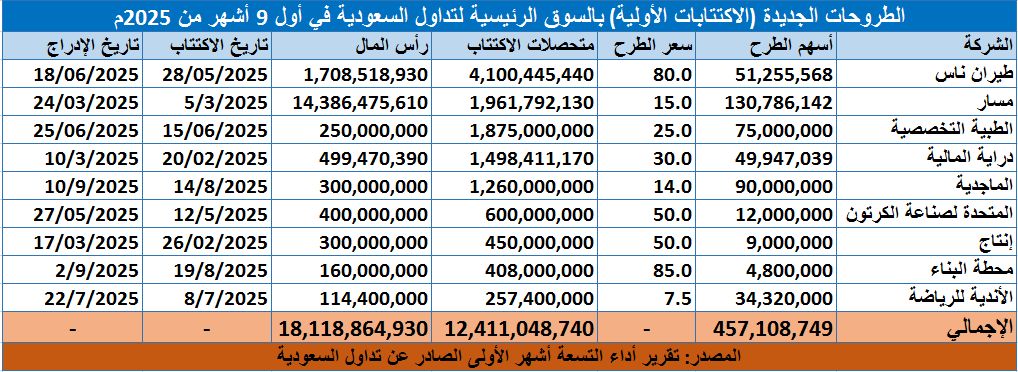 ووصلت حصيلة الطروحات الجديدة في السوق الرئيسية لـ"تداول" 12.41 مليار ريال في أول 9 أشهر من عام 2025م، مقارنة مع 9.25 مليار ريال في الفترة ذاتها من عام 2024م.