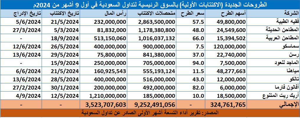 يذكر أن فترة التسعة أشهر الأولى من عام 2024م شهدت طروحات جديدة لـ 9 شركات بالإضافة لصندوق استثمار "أريك ريت المتنوع".