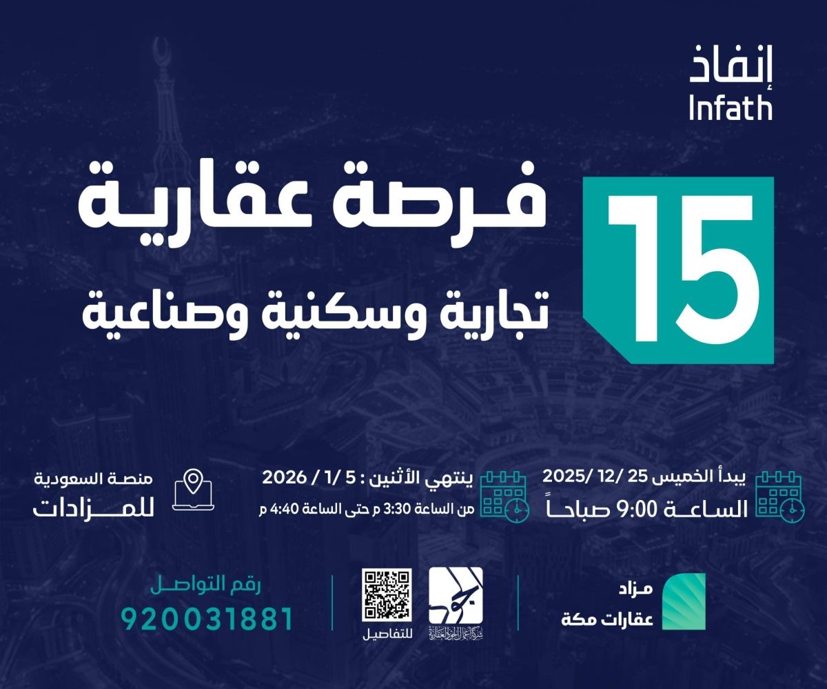 أرض خام وعقارات استثمارية وتجارية وسكنية وصناعية في مكة المكرمة, اليوم الثلاثاء 23 ديسمبر 2025 11:17 صباحاً