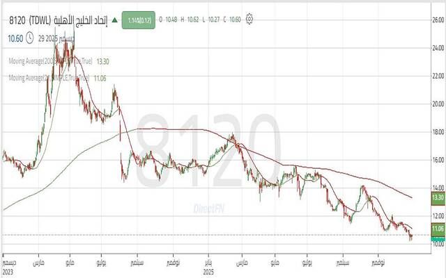 بدأ سهم "اتحاد الخليج الأهلية" تداولاته في 2025 بارتفاع ملحوظ في شهر يناير/ كانون الثاني، وبداية من شهر فبراير/ شباط أظهر السعر قمماً متناقصة، وتعرض لضغوط بيعية حادة استمرت حتى شهر ديسمبر/ كانون الأول، وكان يتخلل الاتجاه الهابط بعض التصحيحات الشرائية ولكن لم تكن قادرة على تحويل الاتجاه.
