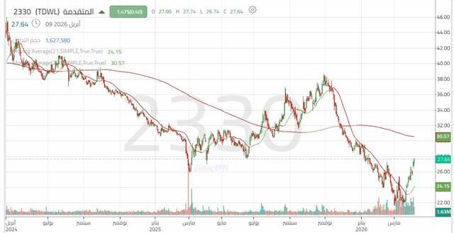بدأ سهم المتقدمة تداولاته خلال الربع الأول من عام 2026 باتجاه هابط ثانوي، ونجح السهم في التماسك من مستوى دعم محوري بالقرب من 22.50 ريال، مع تكوين نموذج انعكاسي مع تزايد في أحجام التداول مما أدى لصعود لاختبار مقاومة 27.25 ريال، وتجاوز هذا المستوى قد يدعم من فرص الصعود خلال الفترة القادمة والتعافي على المدى القصير.