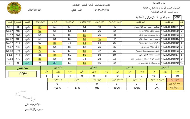 - نتيجة الصف السادس الابتدائي في محافظة الكرخ 1 (رابط pdf النتيجة)