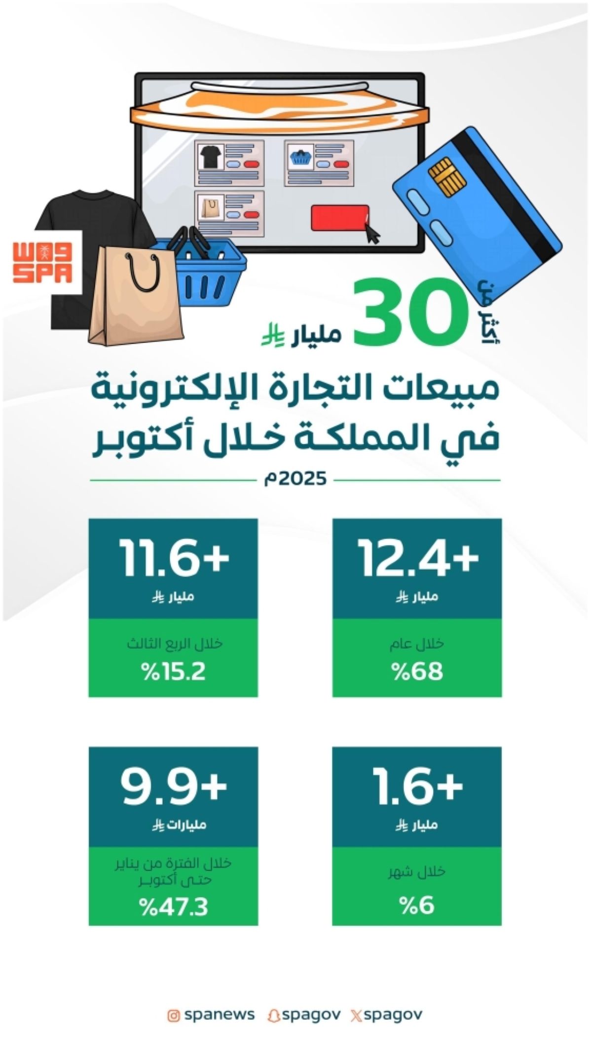 +30 مليار ريال مبيعات التجارة الالكترونية بالمملكة في أكتوبر, اليوم الأحد 28 ديسمبر 2025 11:05 مساءً